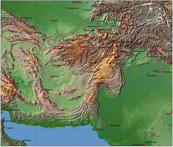 Complete territory and partial adjoining countries ![]() Afghanistan Complete Territory including surrounding countries 56º East to 76º East, 23º North to 40º North Includes Afghanistan and parts of Iran, Pakistan, Turkmenistan, Uzbekistan, Tajikistan, Kashmir & India File size: 74 Mb - Dimensions 4,796 X 4,072 pixels (48 X 40 inches at 100 dpi) Features JPEG relief map with overlaying EPS Illustrator with rivers, roads, towns, town names, provincial and national borders. The relief map has not been screened down and gives a higher contrast effect. ![]() Detail of Afghanistan, Pakistan and Tajikistan border, at 100% size. The relief map placed behind a multi layered Illustrator EPS vector map. ![]()