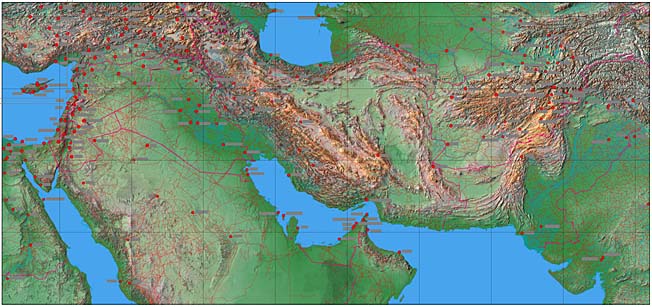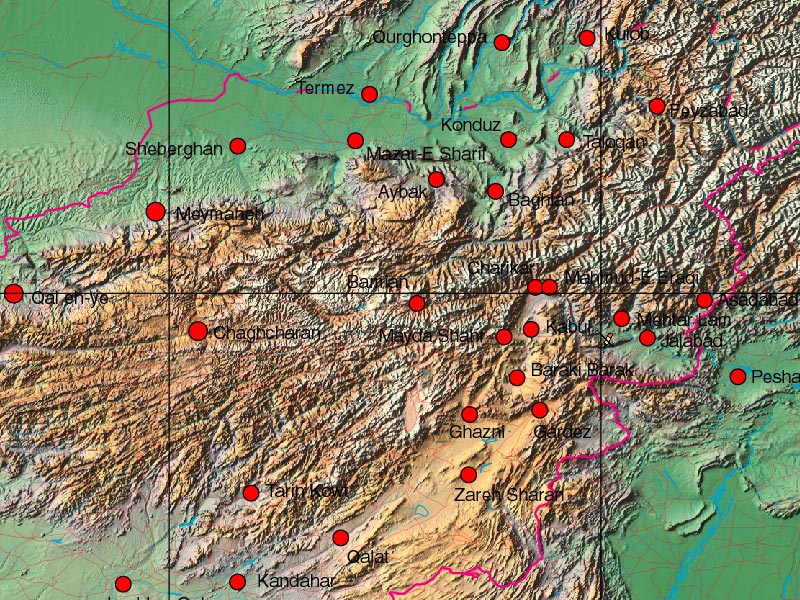 Complete view from Egypt to India ![]() Afghanistan - Complete Territory from Egypt to India 31º East to 76º East, 20º North to 41º North Includes Afghanistan and parts of Iran, Pakistan, Turkmenistan, Uzbekistan, Tajikistan, Kashmir & India File size: 39 Mb - Dimensions 5,398 X 2,517 pixels (54 X 25 inches at 100 dpi) Features JPEG relief map with overlaying EPS Illustrator with rivers, roads, towns, town names, provincial and national borders. The relief map has not been screened down and gives a higher contrast effect. ![]() ![]() Detail of Afghanistan, Pakistan and Tajikistan border, at 100% size. The relief map placed behind a multi layered Illustrator EPS vector map. ![]()