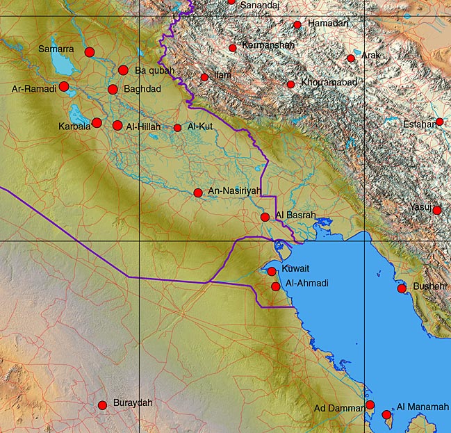 ![]() Iraq and surrounding countries 35º East to 52º East, 24º North to 40º North Includes parts of Saudi Arabia, Iran, Israel, Lebanon, Jordan, Turkey and Kuwait File sizes: Relief map decompressed 100 MB, JPEG 9.5 MB - EPS Illustrator 6.6 MB Dimensions 6,117 X 5,760 pixels (20.39 X 19.20 inches at 300 dpi) Features JPEG relief map with overlaying EPS Illustrator with rivers, roads, towns, town names, and national borders. ![]() ![]() Detail of the same map showing Northern Persian Gulf including Iraq, Kuwait, Saudi Arabia and Iran. There is an alternate choices of relief map that can placed behind a multi layered Illustrator EPS vector map. ![]()