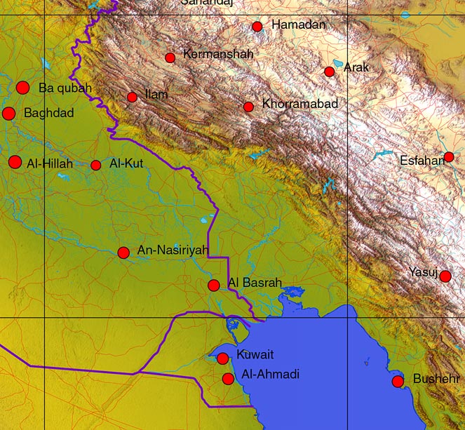 Detail of the same map showing Northern Persian Gulf including Iraq, Kuwait, Saudi Arabia and Iran.